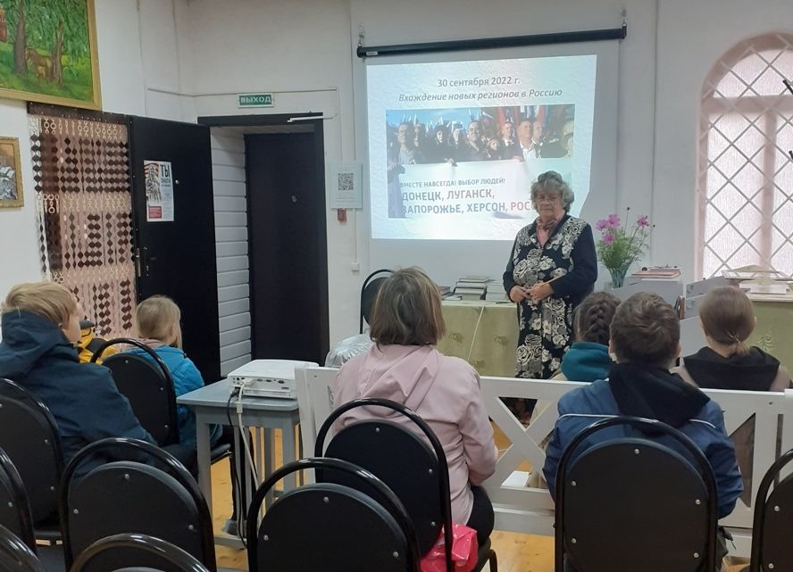 Ребятам было рассказано об истории присоединения этих земель к России в XVIII веке, о передаче их в 1921 году в состав Украинской ССР, об объединительном движении с Россией населения этих территорий в начале 2020-х годов.