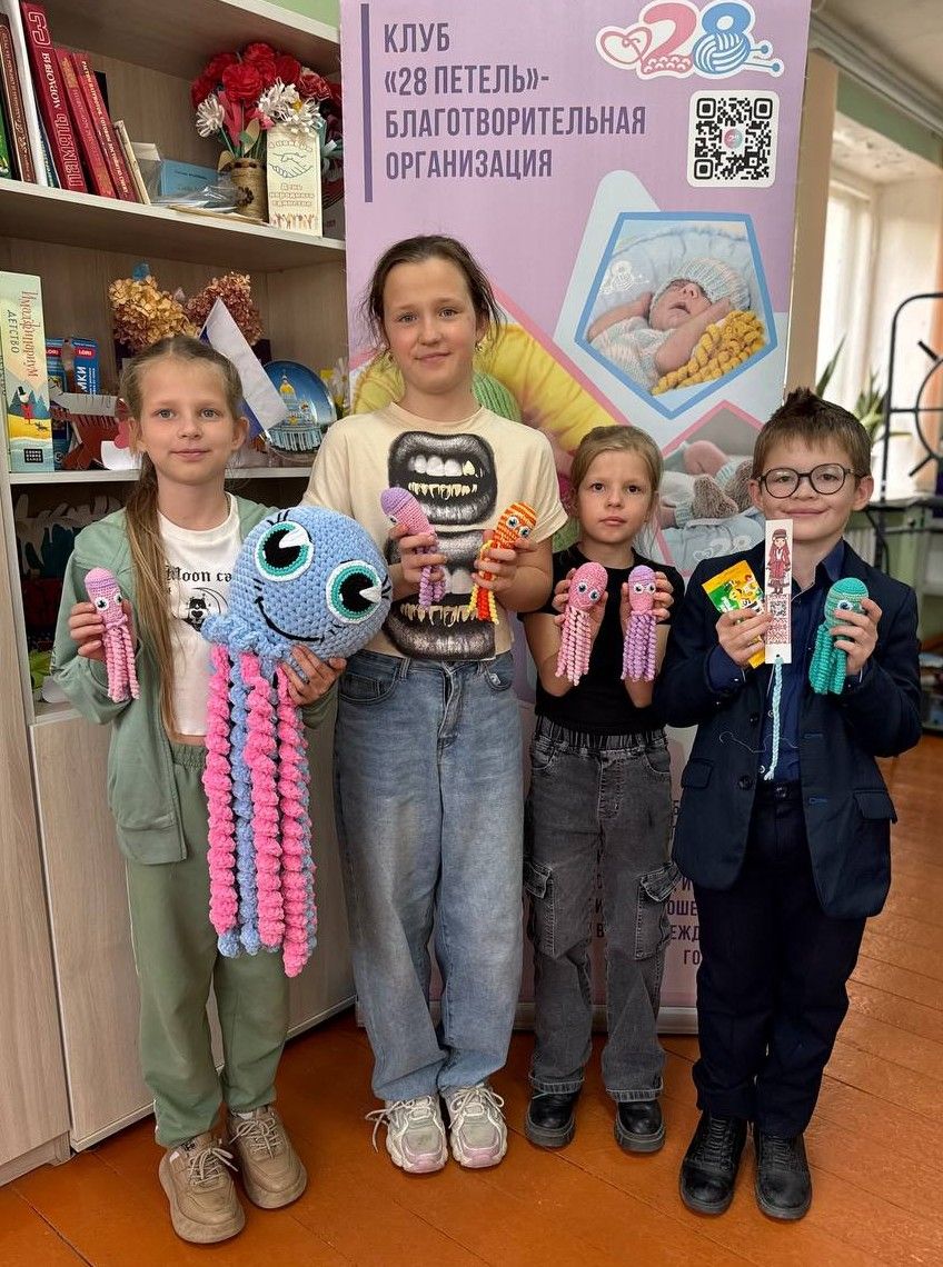 Организация создаёт комфортное пространство с регулярными мастер-классами по вязанию изделий для новорожденных маловесных малышей. Ветошкина Дарья - руководитель АНО «28 петель» познакомила детей с благотворительной деятельностью, с платформой добро.рф, рассказала, как стать частью команды, в чем особенность помощи недоношенным детям. Волонтёры погрузили ребят в мир рукоделия и творчества.