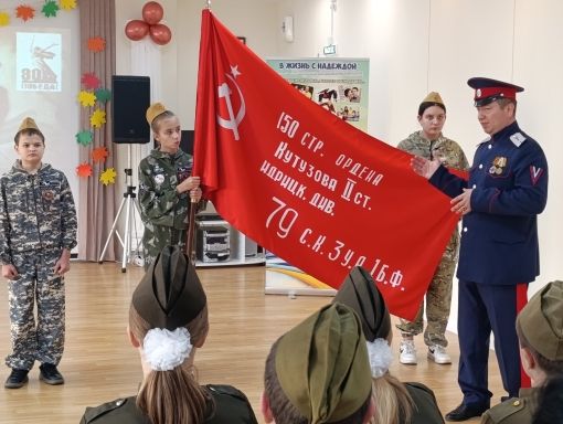На торжественном мероприятии присутствовали почётные гости, включая участника специальной военной операции - Сергея Александровича Косолапова и руководителя поисково-патриотической дружины "Казачок" - Сергея Викторовича Козлова. Для ребят они провели Урок мужества «История штурмового флага 150-й ордена Кутузова II степени Идрицкой стрелковой дивизии».