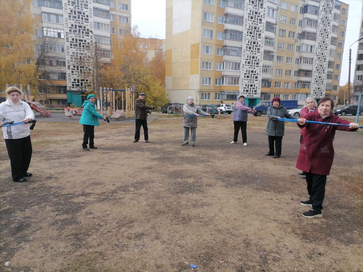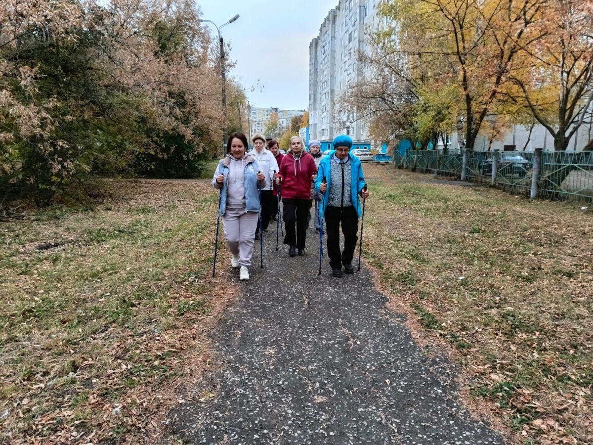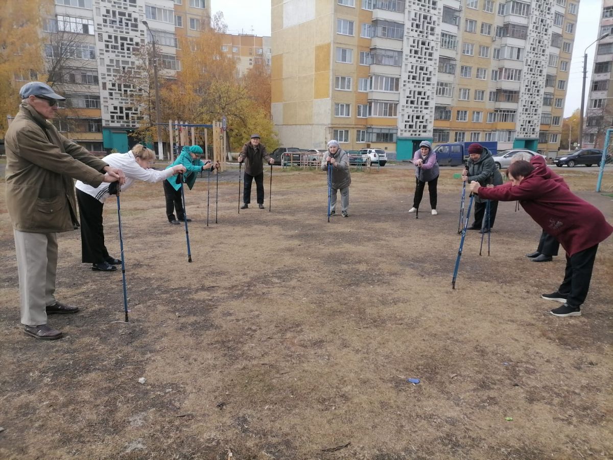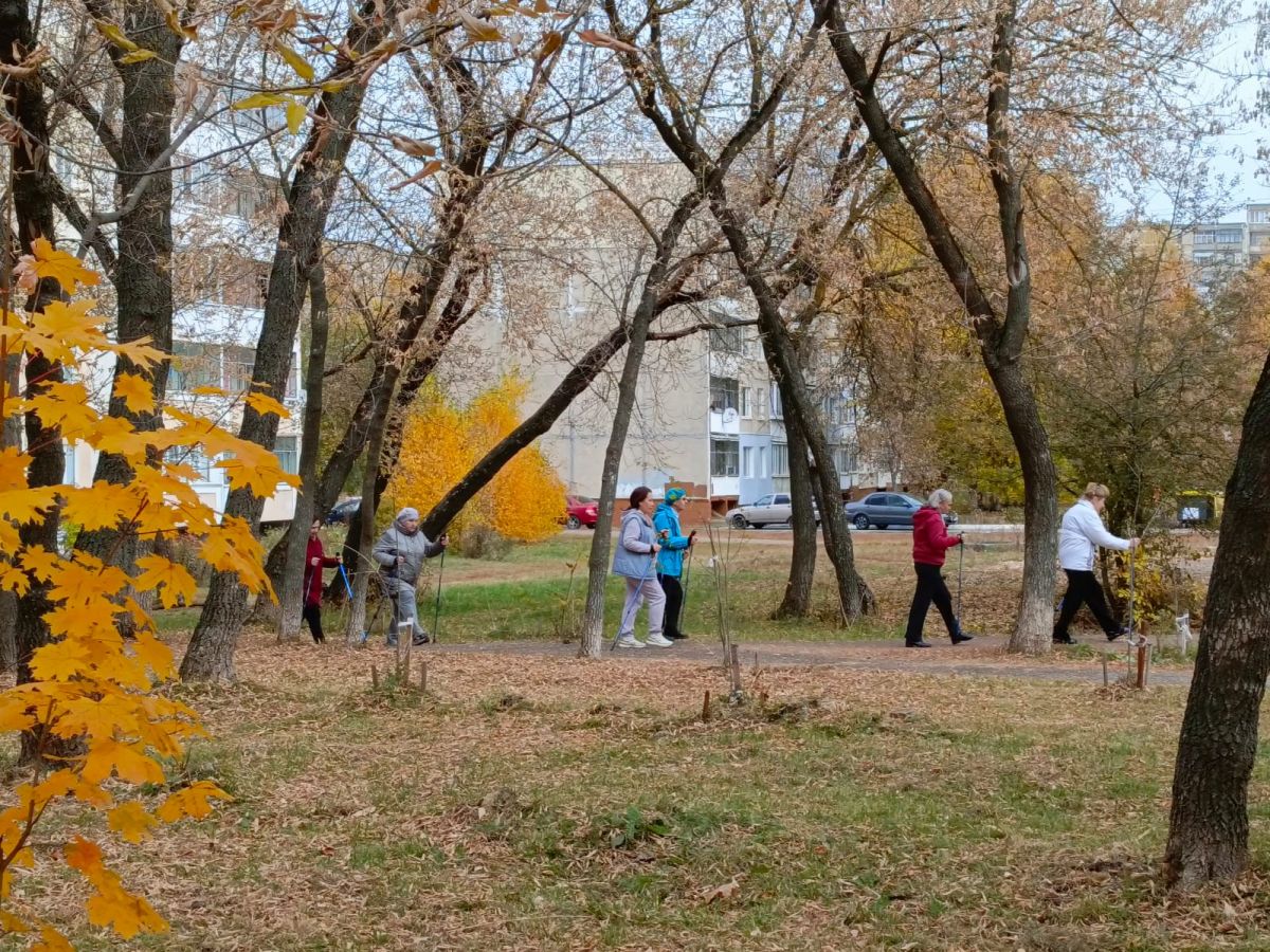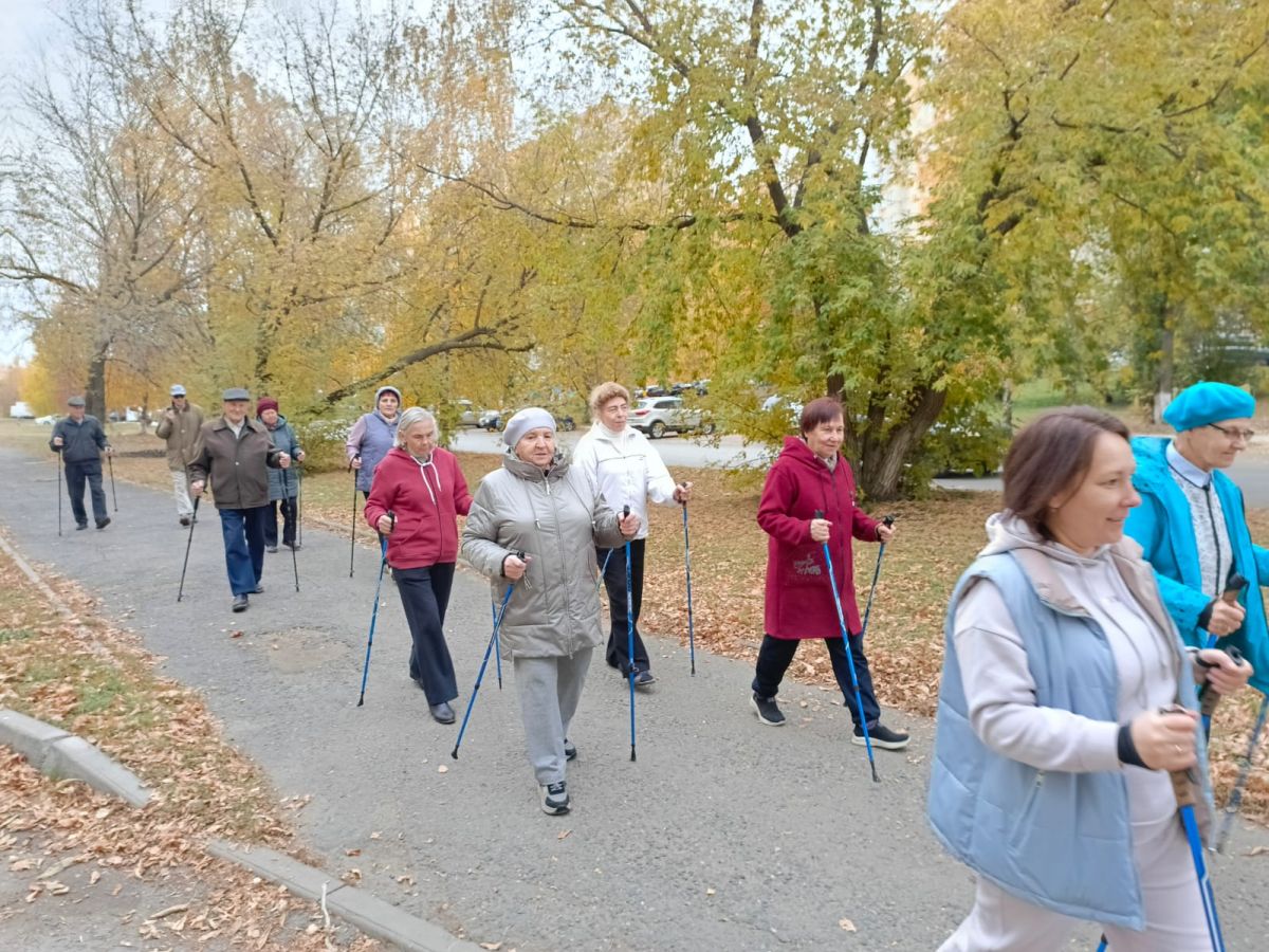 Октябрь дарит хорошую погоду и пенсионеры из отделения дневного пребывания, воспользовавшись милостью природы, вышли на прогулку со скандинавскими палками.