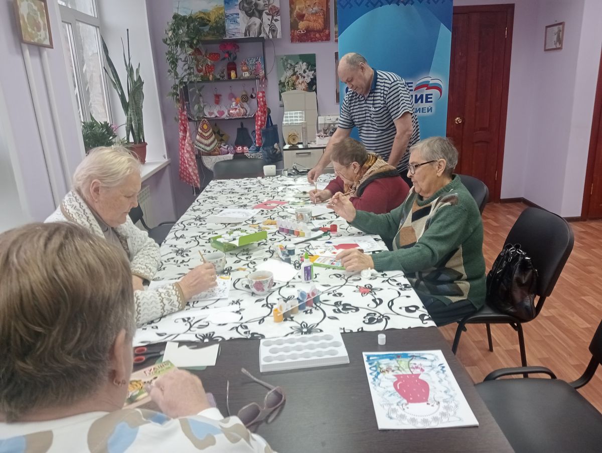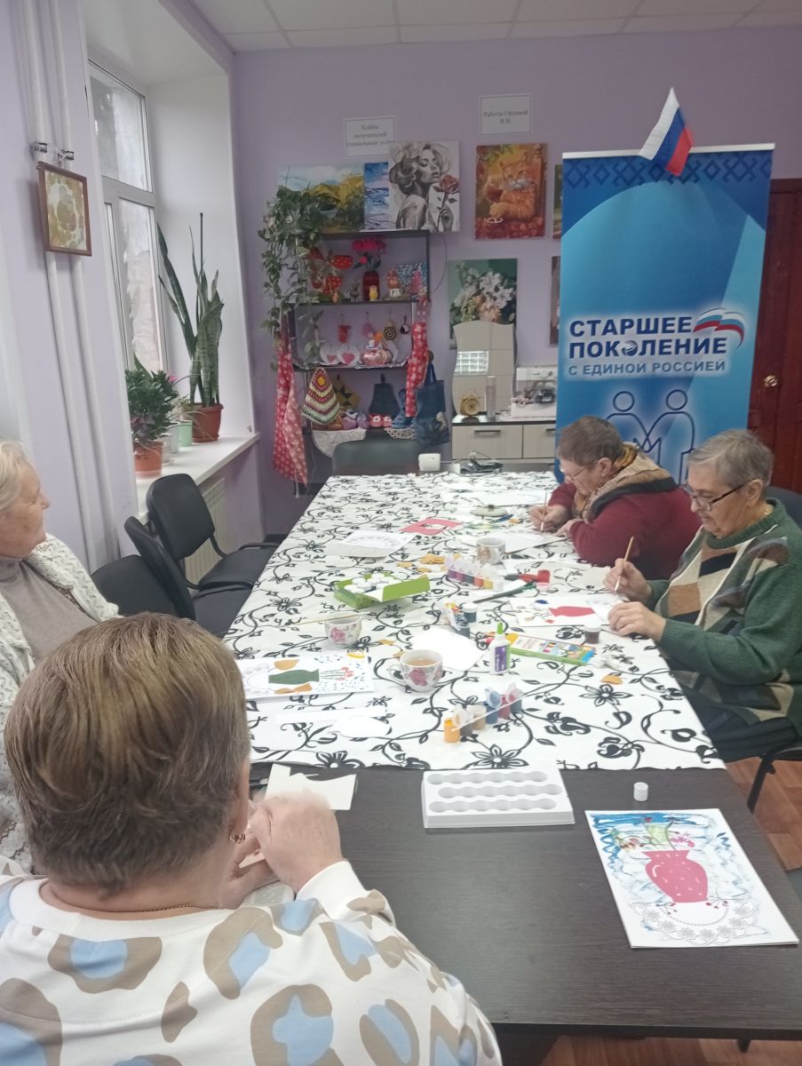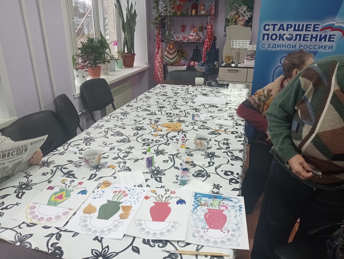 Затем получатели социальных услуг идут на занятие арт-терапевтического занятия в технике аппликации “ Осенний букет в вазе” с отпечатками лиcтьев получатели социальных услуг раскрашивают фон, вырезают и приклеивают вазу и салфетку, а потом создают волшебный букет из настоящих листьев или их отпечатков. Этот метод направлен на позитивное мышление и сохранение когнитивных функции головного мозга, сохранение мелкой моторики и развитие творческих способностей.