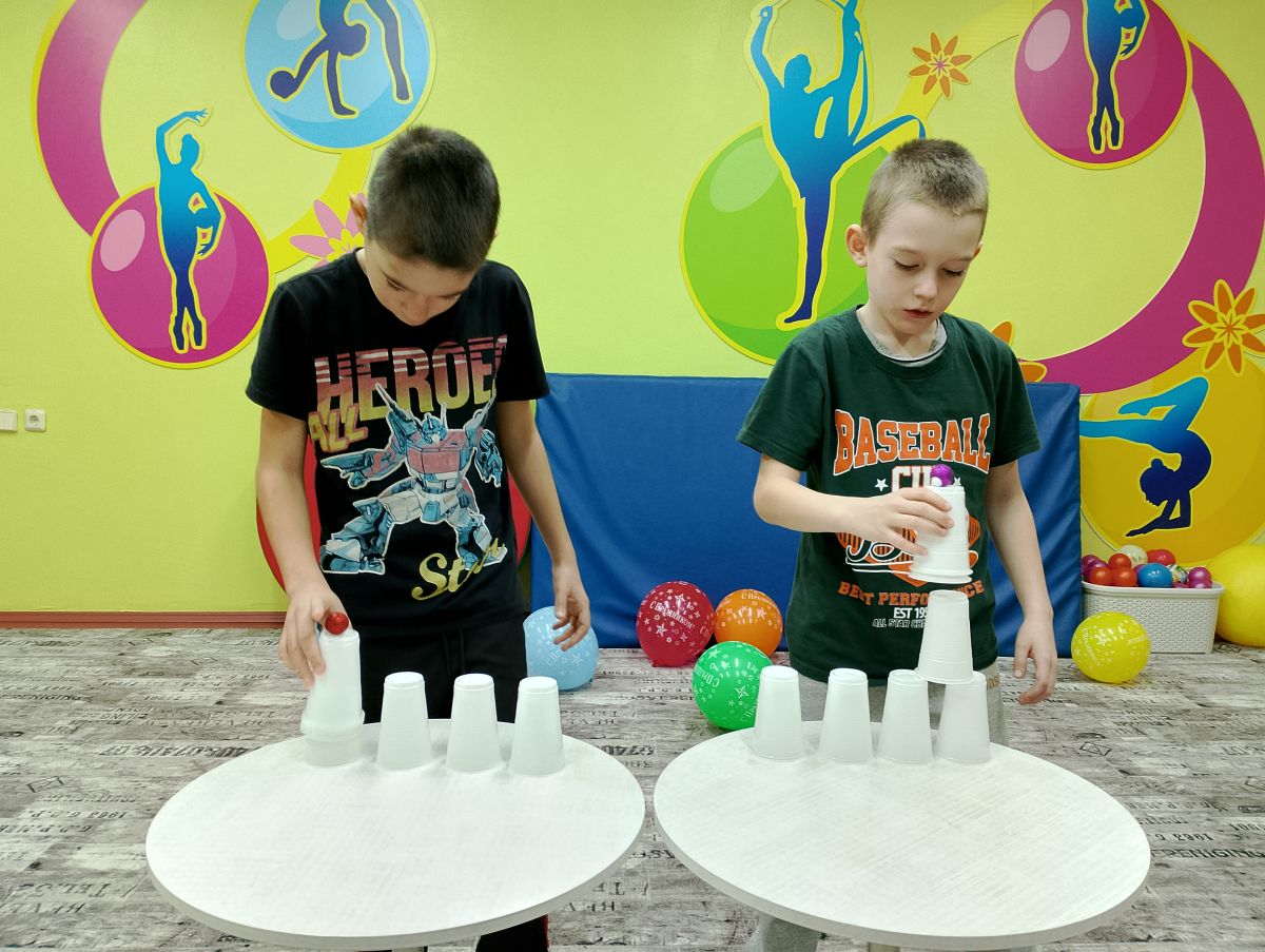 Завершающим аккордом стало задание на координацию "Собери в один". Необходимо было собрать стаканчики, не уронив ёлочную игрушку.