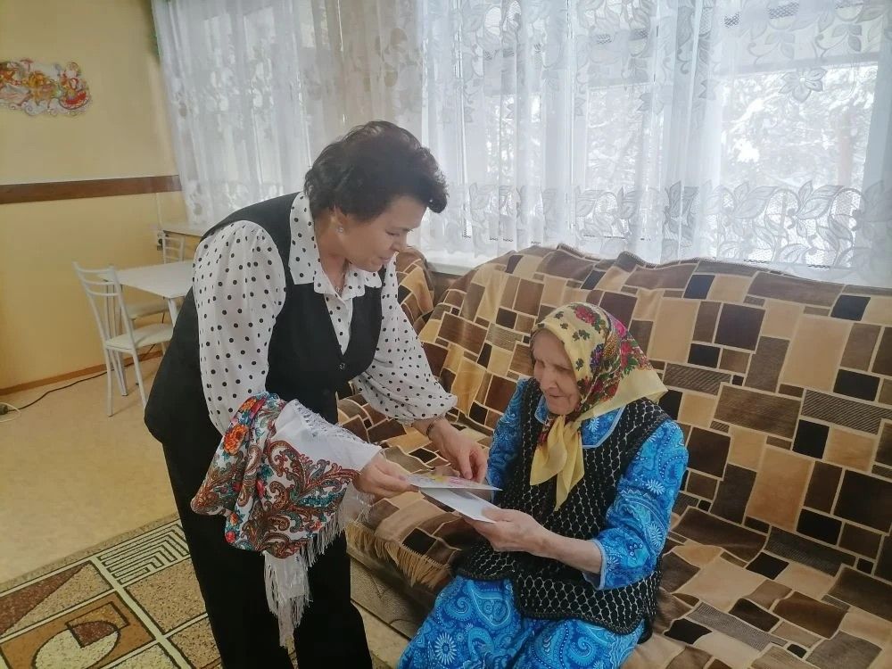 Поздравление труженика тыла Курошину Анну Афанасьевну с 96-летием получателя социальных услуг Старошайговского филиала