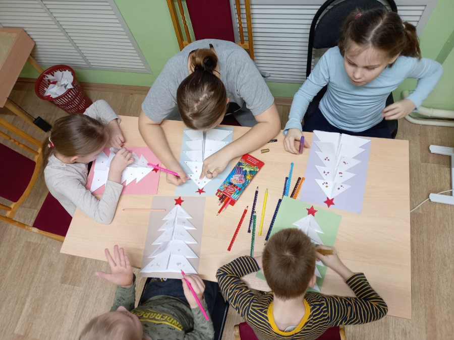 Занятие началось с простого упражнения «Теплый комок», способствующего формированию позитивного настроя: под легкую музыку дети по очереди говорили слово, которое ассоциируется у них с Рождеством и передавали комок. Это упражнение помогло ребятам почувствовать себя частью единого целого, создать атмосферу тепла и доброжелательности. Следующим этапом стало создание ребенком уникальной елочки из бумаги. Во время творческого процесса воспитанники проявляли свою фантазию и творчество, выбирали разные украшения для елочки, проявляли взаимоподдержку. Для восстановления сил и вдохновения дети приняли участие в релаксации: закрыли глаза и представляли исполнение своих добрых и заветных желаний. После создания изделия дети по очереди рассказывали про свою красавицу, сочиняли уникальные сказки про жизнь и индивидуальность Рождественской елочки. Заключительным упражнением стало «Снежинка в кругу»: каждый участник передавал снежинку по кругу и говорил добрые слова и пожелания своему соседу слева. Это упражнение оставило приятные впечатления и улыбки на лицах всех участников.