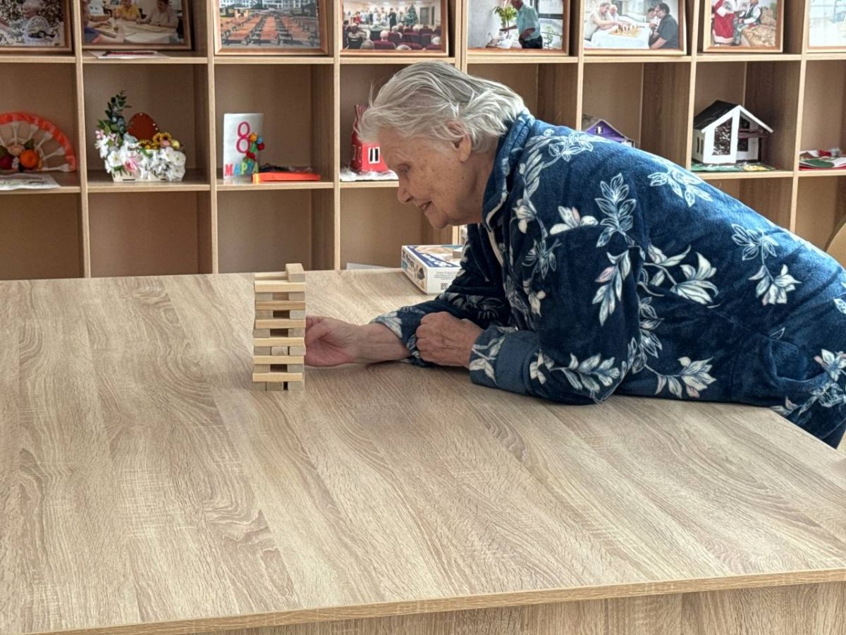 Наши проживающие с энтузиазмом развивают моторику и логику, играя в настольные игры. Особой популярностью пользуется «Падающая башня» — увлекательная игра, которая приносит массу удовольствия и помогает весело провести досуг. «Падающая башня» (Дженга) — отличная настольная игра, развивающая мелкую моторику, концентрацию внимания и пространственное мышление. Она помогает замедлить старение мозга, тренирует ловкость рук, служит профилактикой деменции и снимает стресс. Игра безопасна, увлекательна и способствует социализации, что полезно для эмоционального здоровья.