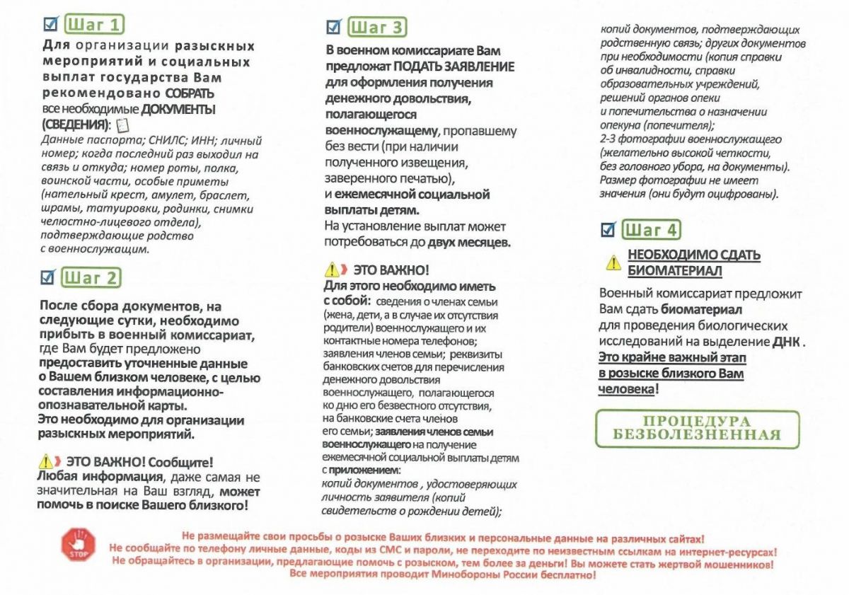 Для поиска военнослужащего существует определенный алгоритм. В какие ведомства нужно обратиться родственникам, которые разыскивают бойца и какую информацию следует предоставить для поиска — читайте в памятке.